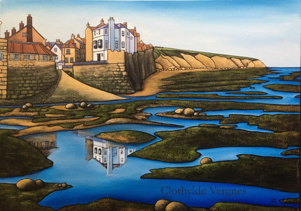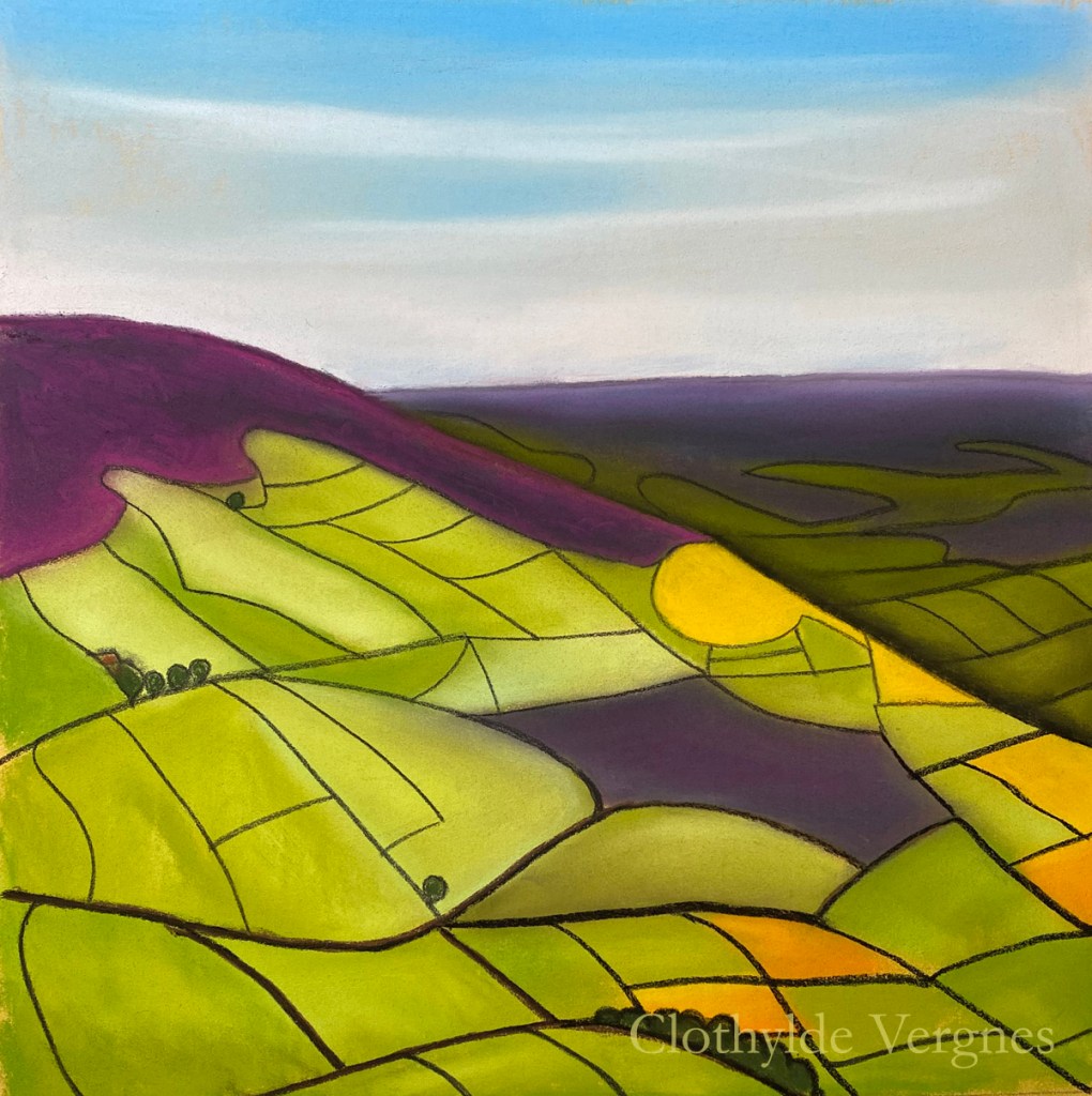Clothylde’s artwork focuses on landscapes in North Yorkshire, whether the open and empty stretches of Moors or the crowded semi-symbiotic relationship of cottages and sea on the coast. Most of her work is in oils on canvas, but she also loves watercolour and pastel. Inspired in practice by her experience of stained glass, whereby colours are contained within boundaries, and conceptually by Paul Klee’s notion of “taking a line for a walk”, these landscapes are personal and stylised interpretations, evolved from quick sketches outdoors and elaborated in her studio.