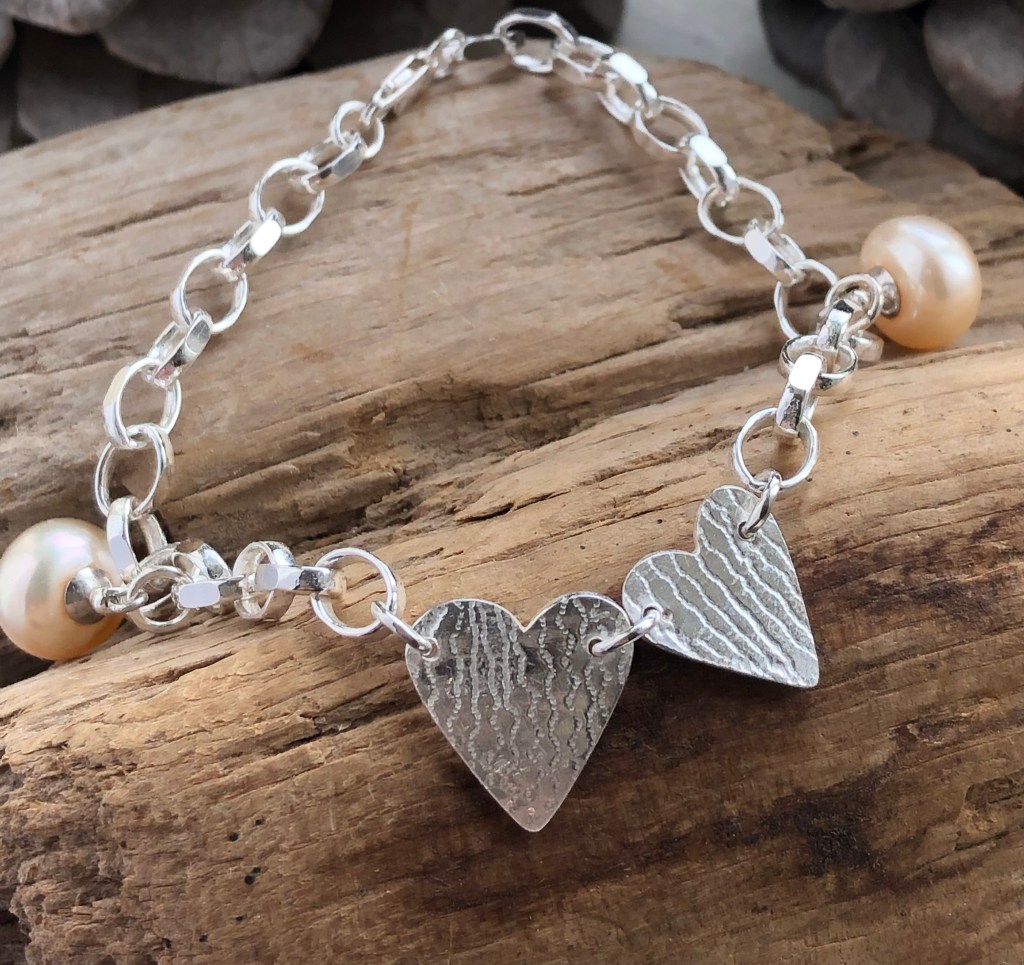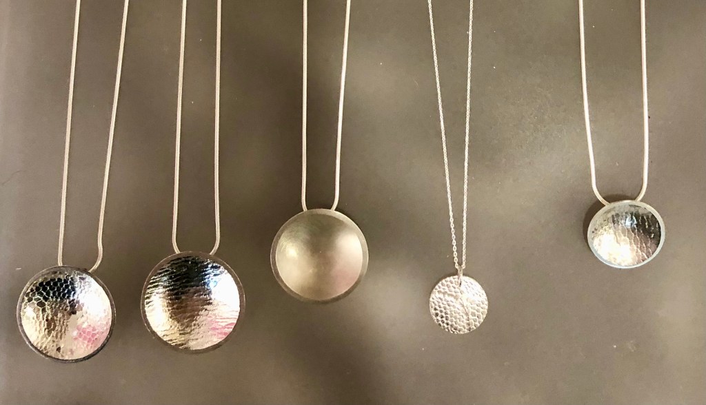 The central theme of her collections is a love of simple lines and shapes. She also likes to use a narrative; such as a title or a story, as represented in her ‘Fortune Fish Tell Tales’ collection of napkin rings, pendants, rings & earrings. Jo works the silver to create a variety of textures before shaping beautiful, contemporary pieces.