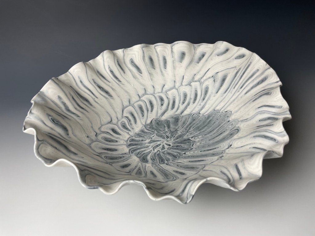 Kit is fascinated by clay in its multitude of colours and textures. Currently she is exploring its extremes with the delicate, flowing, semi-translucent, coloured Parian (porcelain) in stark contrast to her extremely tactile, burnished, sawdust fired pieces. The work is sometimes functional, often sculptural but always visually exciting.