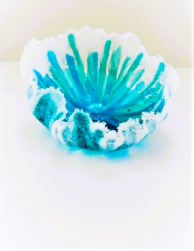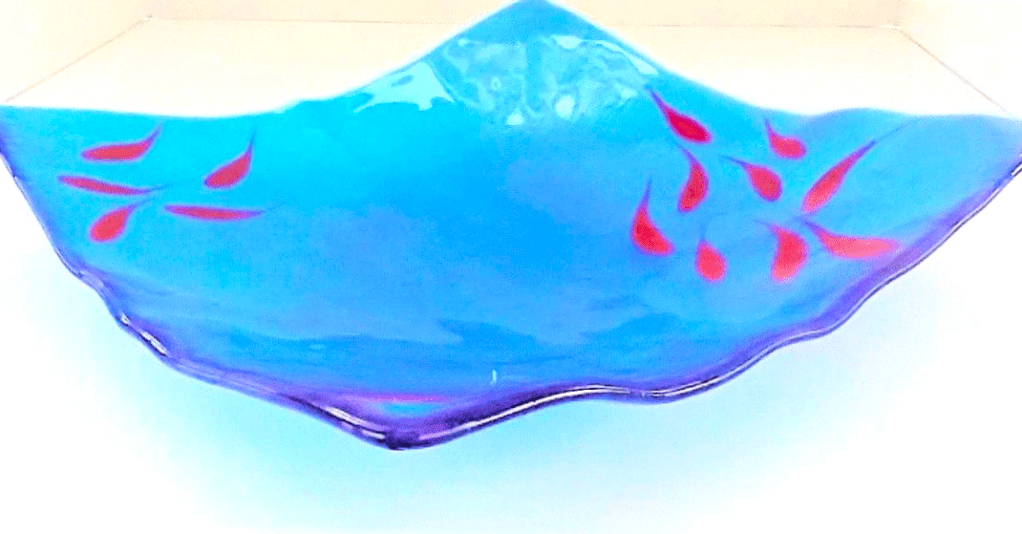 I enjoy experimenting with colour and form or using glass as a blank ‘canvas’ to create more illustrative work. I find it works very well for reflecting my love of nature, particularly of the sea where I use various techniques to develop the feeling of depth and movement in water.