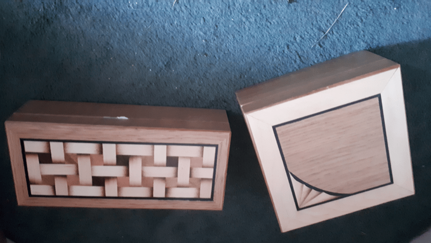 Handmade oak boxes for small items with veneered tops for smaller jewellery items i.e. earrings and less expensive ones with wooden motifs for pencils/children’s ‘treasures’ etc.