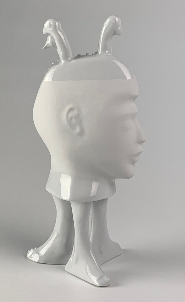 My porcelain works combine different pieces joined before firing, then using third firing techniques I draw my own designs, using nibs and brush with glazes and re-fire them.